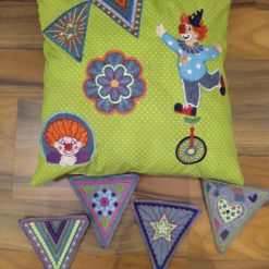 Mit diesen Stickis könnt Ihr ganz wunderbar zum fröhlichen Clownfenster auch die passenden Kissen, Lampenschirme, Bilderrahmen (evtl. beleuchtet), Lichtbeutel oder gar die KIGA-Tasche verschönern. Aber auch Mützen – Halssocken u.s.w. sind dankbar für jede Abwechslung.
